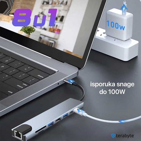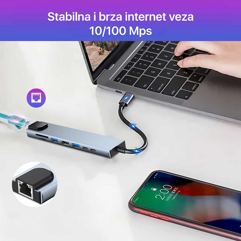 Karakteristike:- 8-u-1 adapter: Type-C muški na Type-C / HDMI / USB priključke