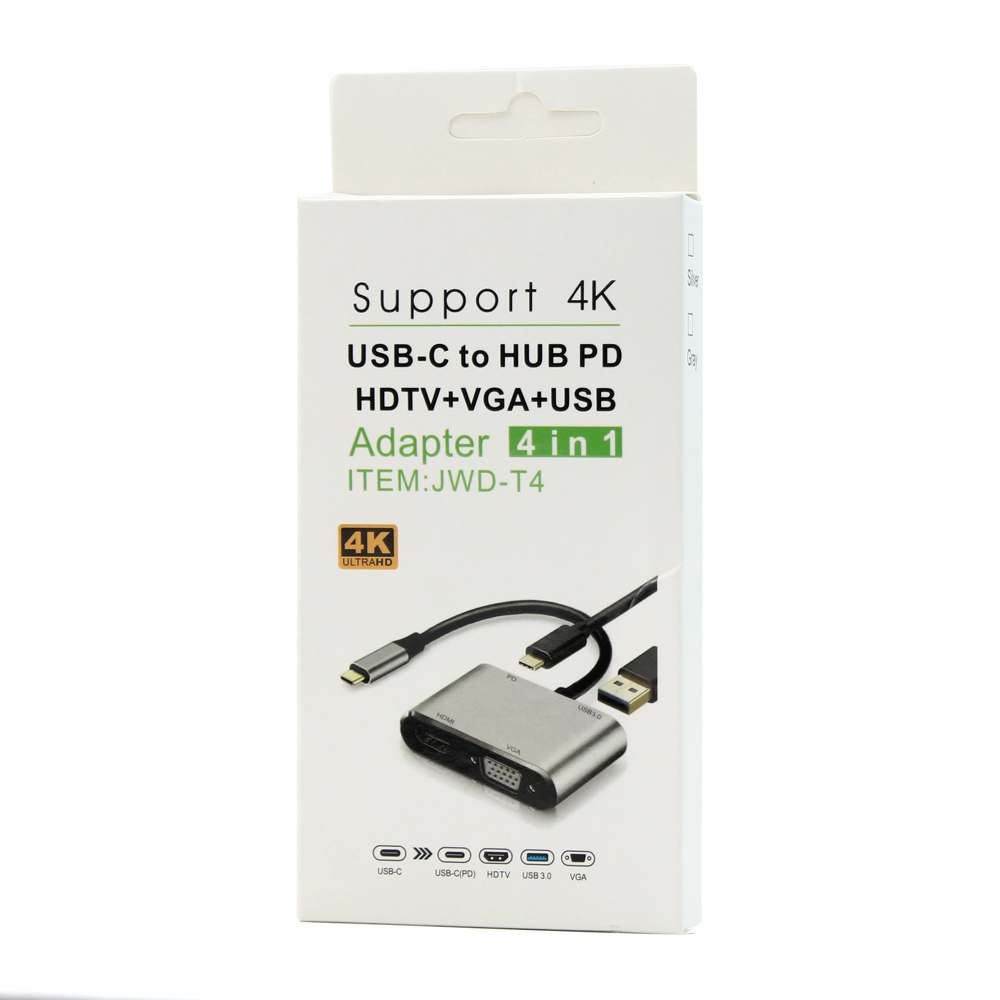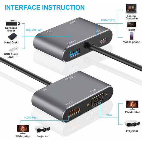 Adapter Type C na HDMI VGA PD USB3.0 4 u 1 sivi