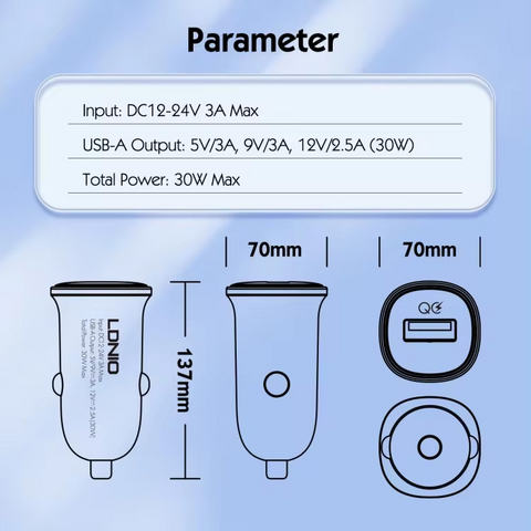 Auto punjac LDNIO C105, QC3.0, 30W USB Type C crni