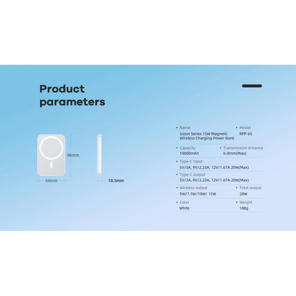 Back Up baterija (univerzalna) prenosiva baterija Magsafe REMAX Usion Series RPP-65 PD 20W + QC 15W Fast Charging 10000mAh beli