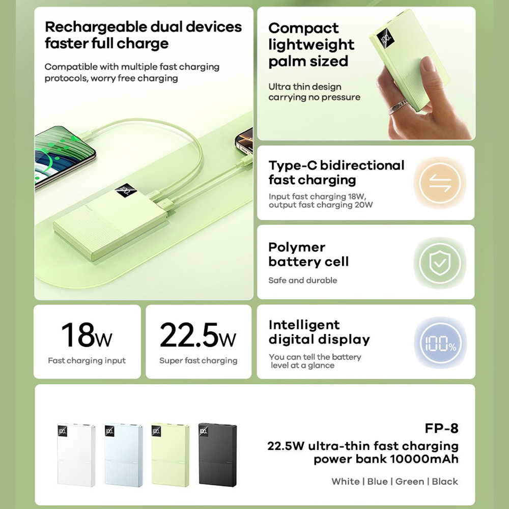 * Type-C dvosmerno brzo punjenje, ulaz 18W za brzo punjenje, izlaz 22.5W za superbrzo punjenje, kompatibilan sa PD20W brzim punjenjem; USB izlaz za superbrzo punjenje 22.5W;
