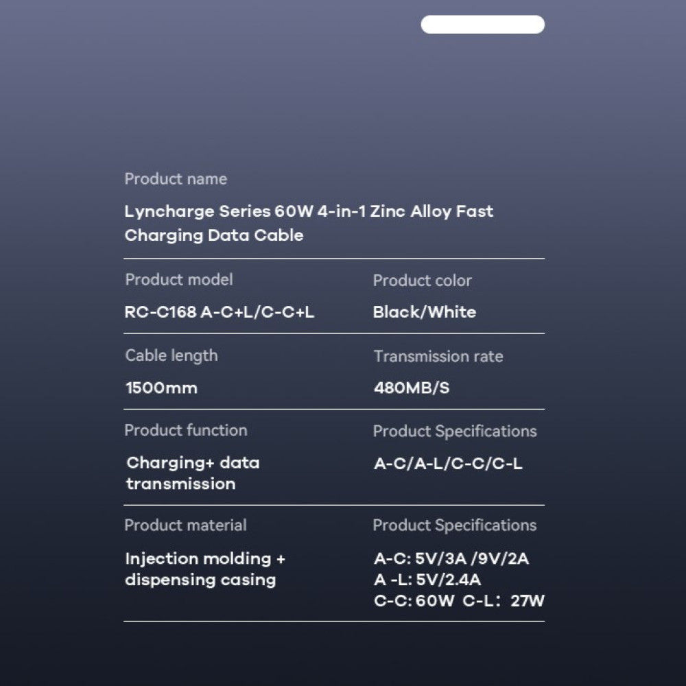 Data kabl REMAX RCC-168 Lyncharge Series 60w 4-in-1 Zinc Alloy crni