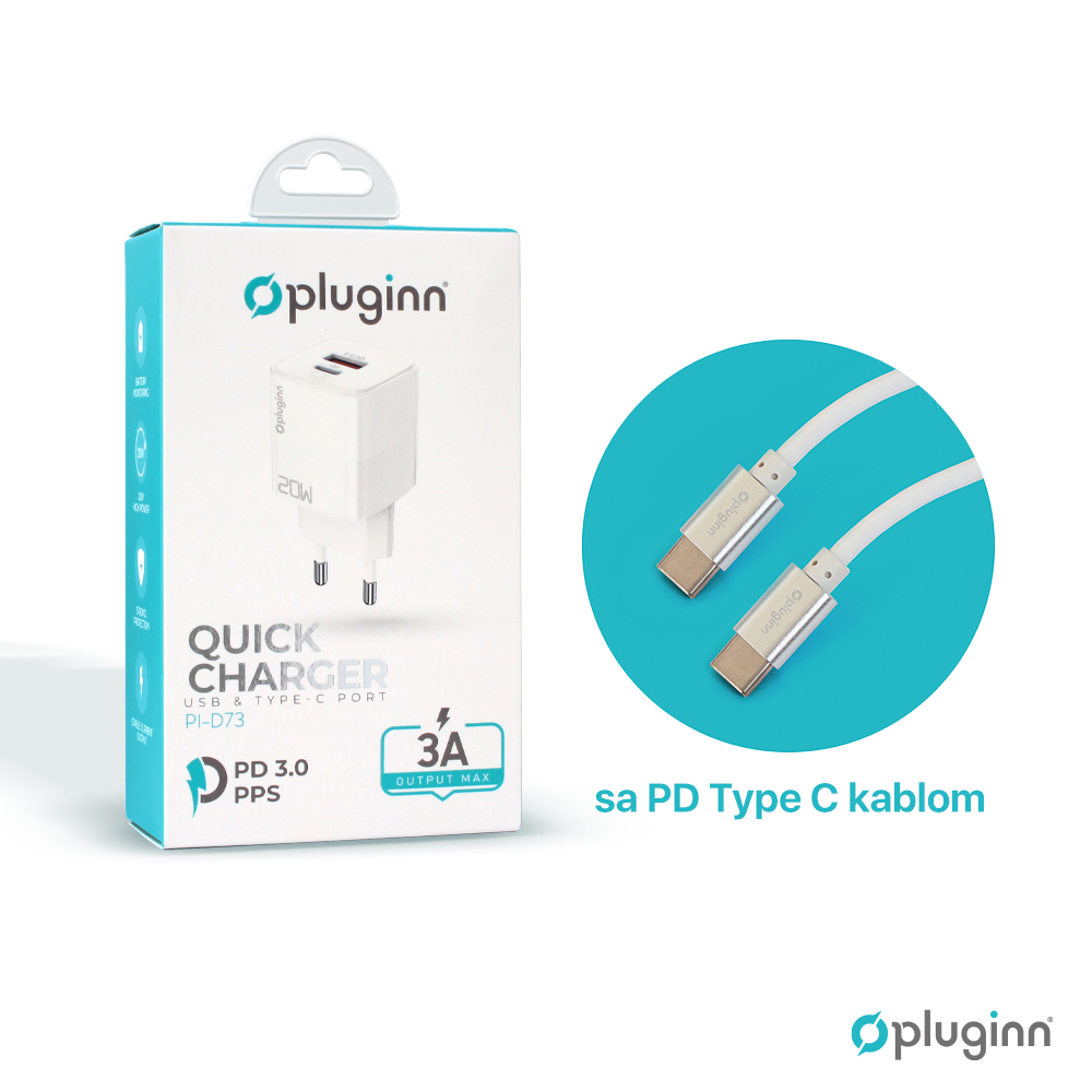 Kucni punjac Pluginn PI-D73, QC3.0 PD3.0, PPS, USB-PD 18W+20W, 38W (total) sa PD Type C kablom beli CE