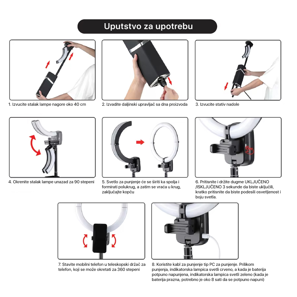 Podesiva jačina svetla: Sa mogućnošću podešavanja osvetljenja od 0% do 100%, ova ring lampa pruža optimalno osvetljenje za svaki video scenario.