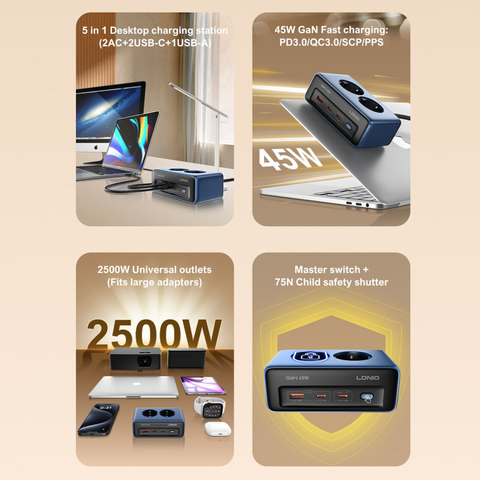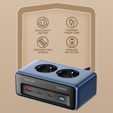 Produzni kabl LDNIO SE3, 2 uticnice, USB, 2xPD, 5u1, GAN, 45W total power