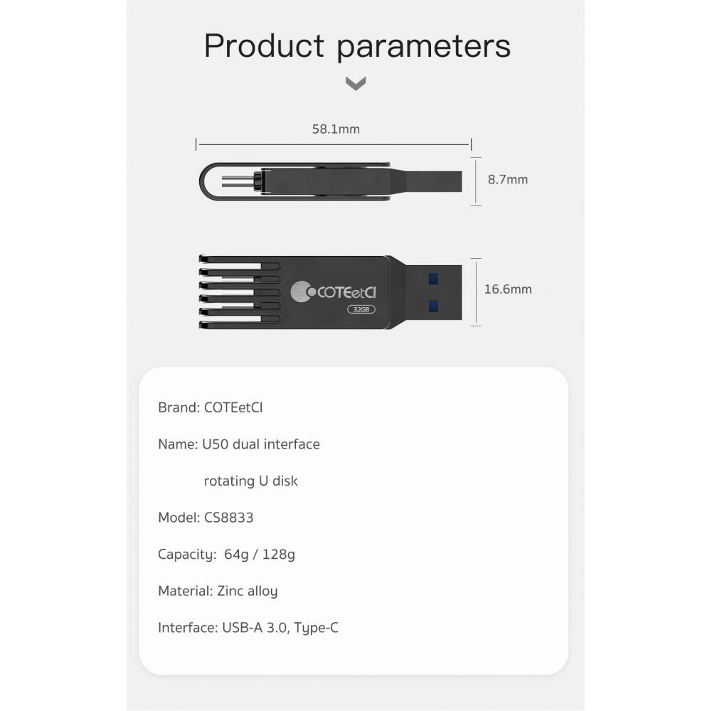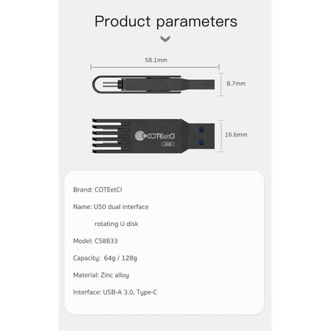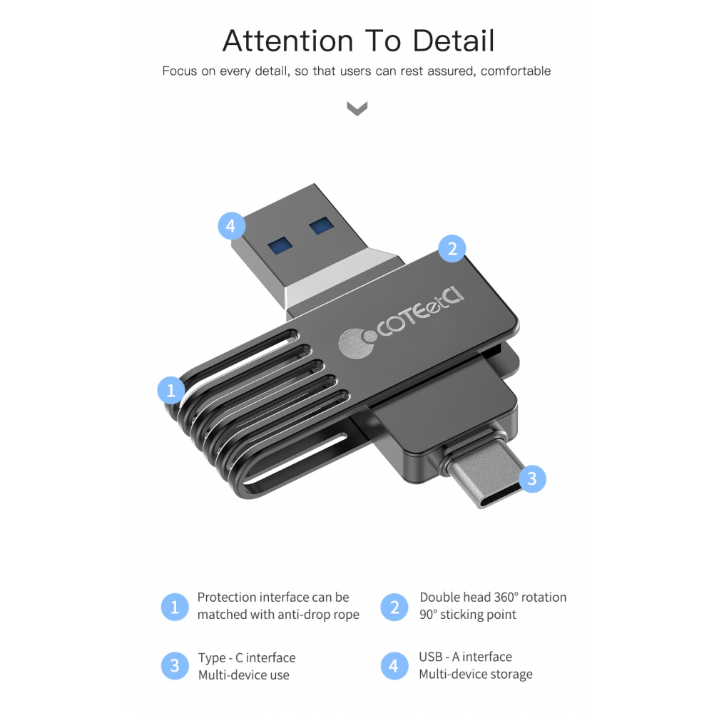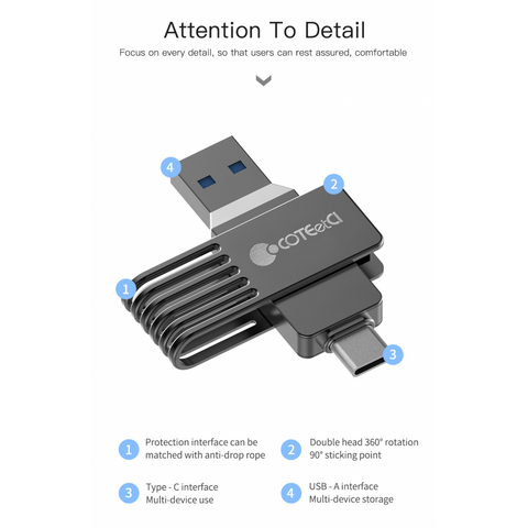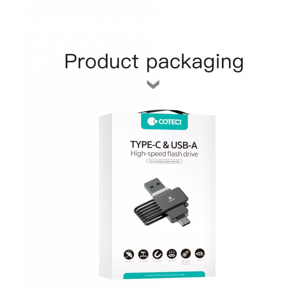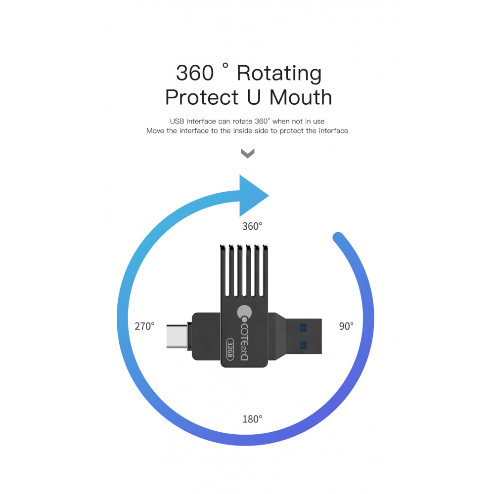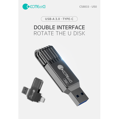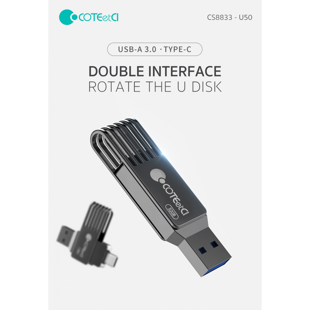 Fleš disk COTEetCI High-speed Flash Drive Type-C & USB-A 32 GB je kompaktan i univerzalan fleš disk koji ima dva porta – USB-A i novi Type-C standard. Pogodan je za brzo oslobađanje prostora na vašem pametnom telefonu ili tabletu.